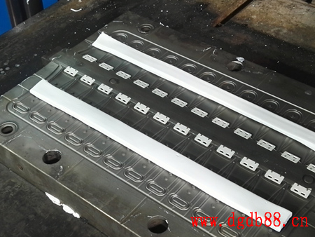 步驟2:加熱模具至180°后,上下兩片模具合并,膠狀的硅膠小條在高溫和壓力下,緊貼模具內(nèi)壁表面成型,100秒后成型完畢