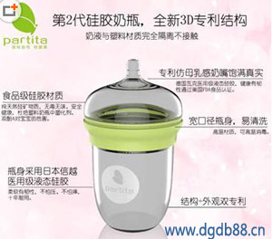 硅膠是一種材料,是一種能讓歐美等國(guó)家非常喜愛(ài)的材料,因?yàn)樵絹?lái)越多的產(chǎn)品開始選擇用這樣的材料開始生產(chǎn),比如說(shuō)硅膠奶瓶;硅膠奶嘴;圍兜等,最近就有一款新上市的奶瓶“partita” 這款產(chǎn)品是純硅膠打造,瓶身是高透明硅膠材質(zhì),瓶蓋和奶頭也是硅膠透明材質(zhì),從上倒下,看起來(lái)更像是一個(gè)可愛(ài)的寶寶,既然是高透明的硅膠生產(chǎn),那么產(chǎn)品100%是過(guò)食品級(jí)FDA認(rèn)證,不管是經(jīng)過(guò)多少度的高溫開水,都不會(huì)釋放出有害物質(zhì),這款硅膠奶瓶是由加拿大布迪家居開發(fā)生產(chǎn)。從硅膠本身的特性來(lái)說(shuō),硅膠是一種無(wú)色;無(wú)味;無(wú)毒的天然合成物質(zhì)。