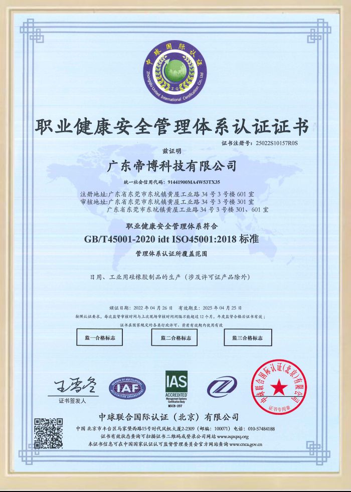 廣東帝博科技有限公位于2019年起施行每年檢測認證報告,由于硅膠制品行業(yè)屬于環(huán)保安全行業(yè),客戶的需求以及反饋都決定我們的實力,目前我司已認證ISO9001、ISO14001、ISO45001、迪士尼認證、FDA、ROHS、LFGB、CPC等一系列檢測認證